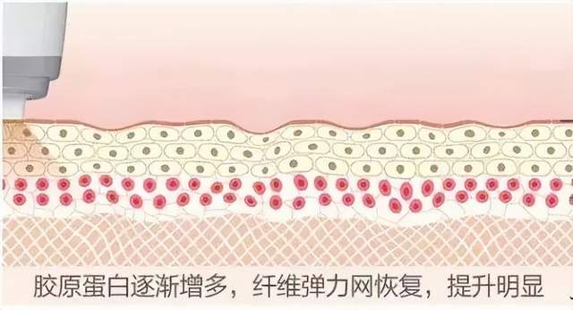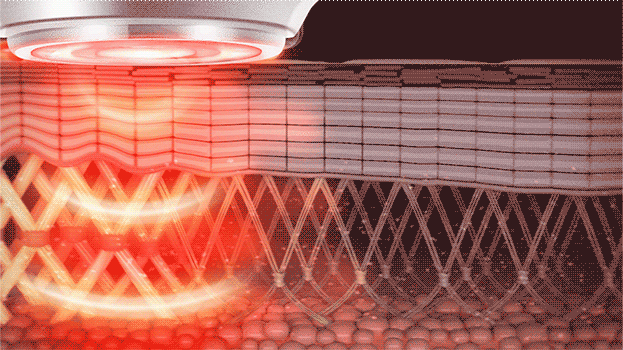 射频波击破表皮基底暗色素,加热55°C-659C胶原纤维收缩拉紧松垮皮肤,提拉紧实。